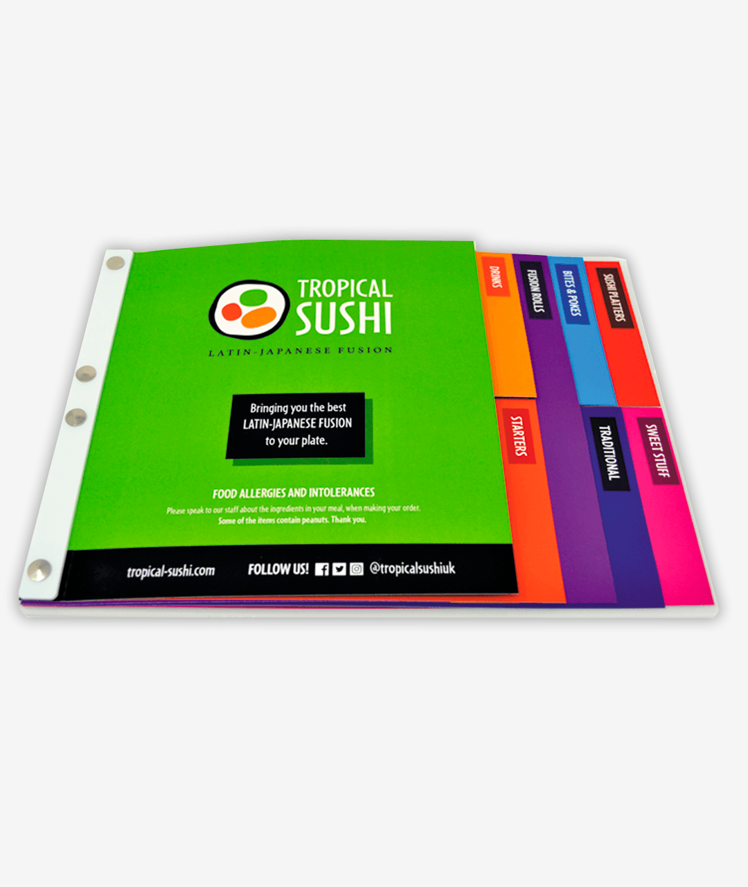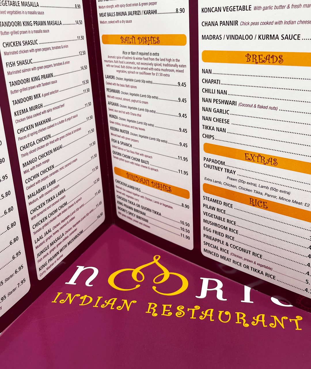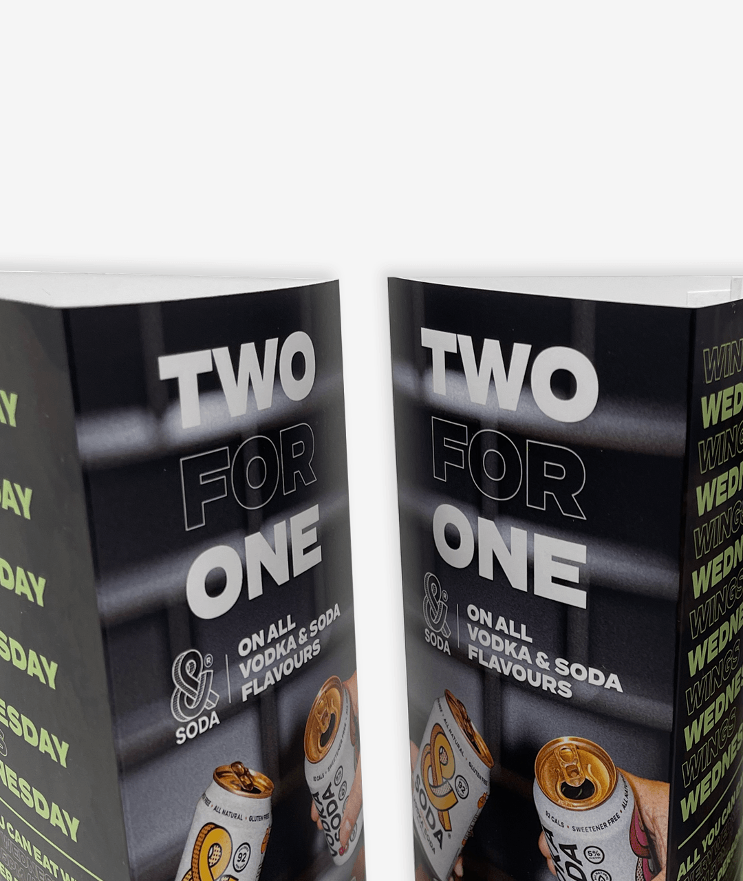 Why not laminate and complete your menu with a protective coating to ensure longevity and resistance from drinks and spills? We provide matt, gloss and velvet lamination or you can opt for an anti-bacterial coating. Another great alternative is our NeverTear material, a water-proof, grease-proof, wash-proof and tear-resistant material!
